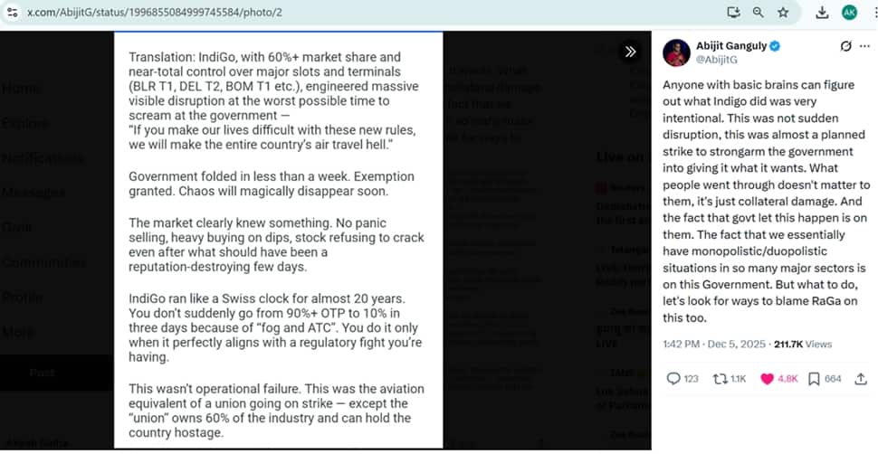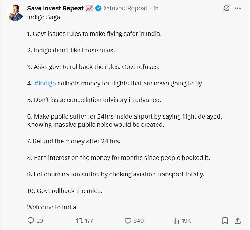 “Anyone with basic brains can figure out what Indigo did was very intentional. This was not sudden disruption, this was almost a planned strike to strongarm the government into giving it what it wants. What people went through doesn’t matter to them, it’s just collateral damage. And the fact that govt let this happen is on them. The fact that we essentially have monopolistic/duopolistic situations in so many major sectors is on this Government. But what to do, let’s look for ways to blame RaGa on this too….IndiGo, with 60%+ market share and near-total control over major slots and terminals (BLR T1, DEL T2, BOM T1 etc.), engineered massive visible disruption at the worst possible time to scream at the government — “If you make our lives difficult with these new rules, we will make the entire country’s air travel hell,” said another user.