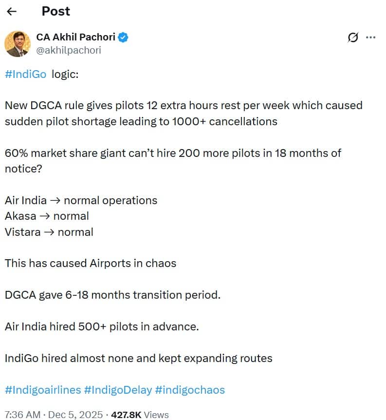 “IndiGo logic: New DGCA rule gives pilots 12 extra hours rest per week, which caused a sudden pilot shortage leading to 1000+ cancellations. 60% market share giant can’t hire 200 more pilots in 18 months of notice? Air India – normal operations, Akasa – normal, Vistara – normal. This has caused Airports in chaos. DGCA gave 6-18 months transition period. Air India hired 500+ pilots in advance. IndiGo hired almost none and kept expanding routes,” said another user.